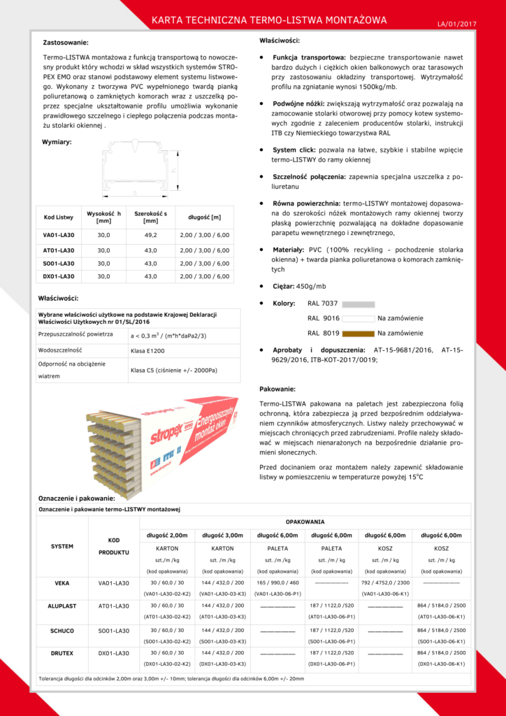 Czym jest termo-listwa montażowa? To nowoczesny produkt, wykonany z PVC wypełnionego twardą pianką poliuretanową, wchodzący w skład wszystkich systemów STROPEX EMO i stanowiący podstawowy element systemu listwowego. Specjalne ukształtowanie profilu sprawia, że możliwe jest wykonanie prawidłowego szczelnego i cieplnego połączenia podczas instalowania stolarki okiennej. Na liście najważniejszych właściwości termo-listwy montażowej znajduje się: funkcja bezpiecznego transportu, zwiększające wytrzymałość podwójne nóżki, ułatwiający montaż system click, szczelność połączeń gwarantowana przez specjalną uszczelkę z poliuretanu, a także równa i płaska powierzchnia pozwalająca na dokładne dopasowanie parapetu zewnętrznego oraz wewnętrznego.